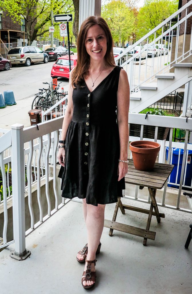 This is the kind of button-front, cool and casual lightweight dress that I always thought would be practical to have in my wardrobe, both to wear at home and for travel. It’s versatile enough to dress up or down, and it’s a classic style that looks cool and breezy. Here it is on me: