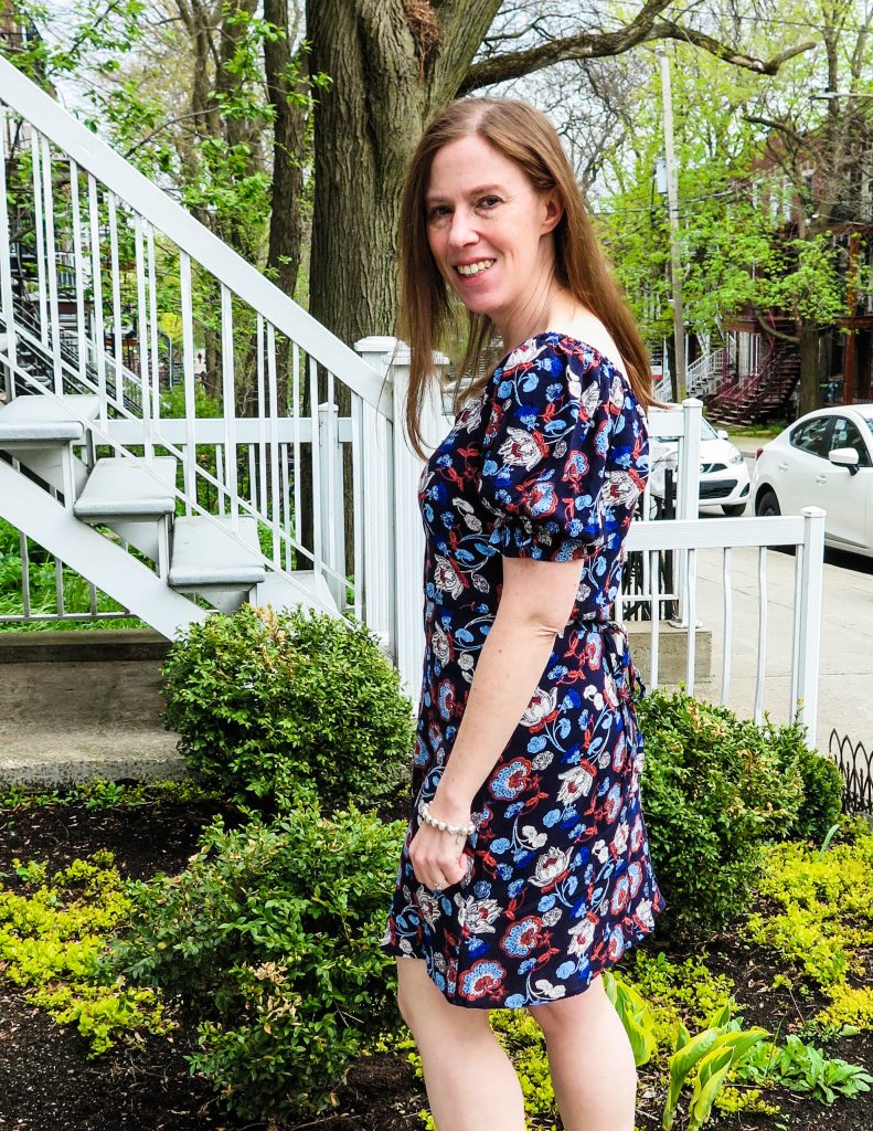While not as good as the black dress, I actually like this one. The print is cute and the colour is good on me. In my usual size of 4P US, it fit pretty well. The neckline is a bit wide on my narrow shoulders — a common problem for me with dresses, even ones ostensibly cut for petites — so the sleeves keep slipping off my shoulders. This sweetheart neckine with puffed sleeves look is very on trend right now, but as a pear-shaped petite with narrow shoulders, I really struggle to wear it. I’ll have to take it in or add a criss-cross ribbon strap or something to keep them in place.
